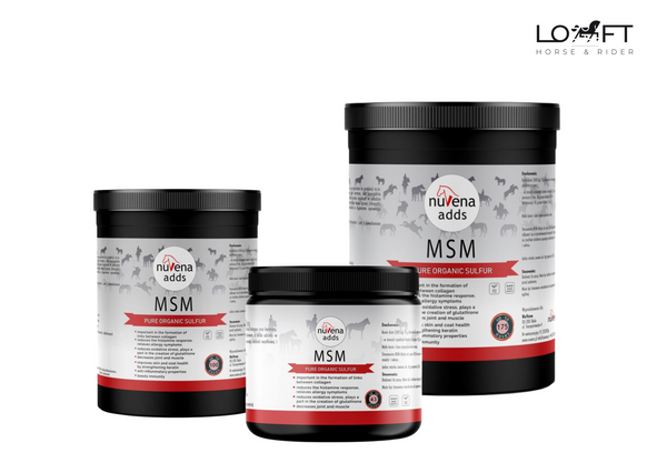 • Suplementacja MSM wspiera aparat ruchu konia, łagodzi stany zapalne, poprawia kondycję skóry, sierści i kopyt oraz wspomaga regenerację mięśni po intensywnym wysiłku.