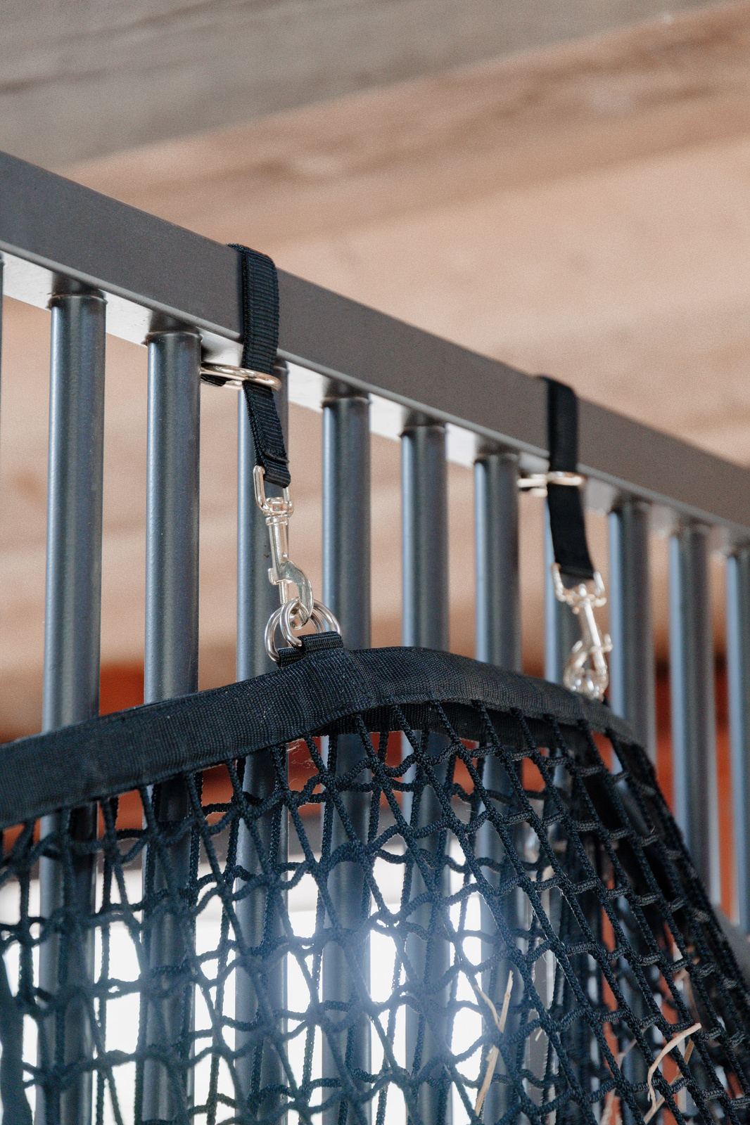 Solidna, trwała siatka została zaprojektowana do codziennego użytku w warunkach stajennych, a cztery wzmocnione pierścienie umożliwiają bezpieczne i elastyczne zawieszenie na różnych wysokościach, w zależności od potrzeb konia i rodzaju boksu.