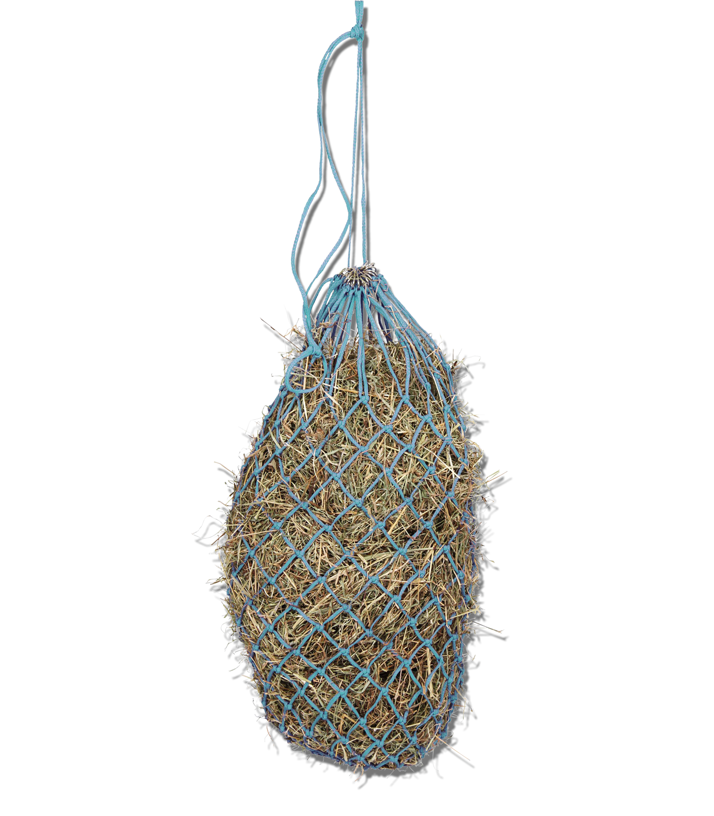 Wytrzymała siatka na siano z małymi oczkami, wyposażona w 15 metalowych pierścieni ułatwiających mocowanie.