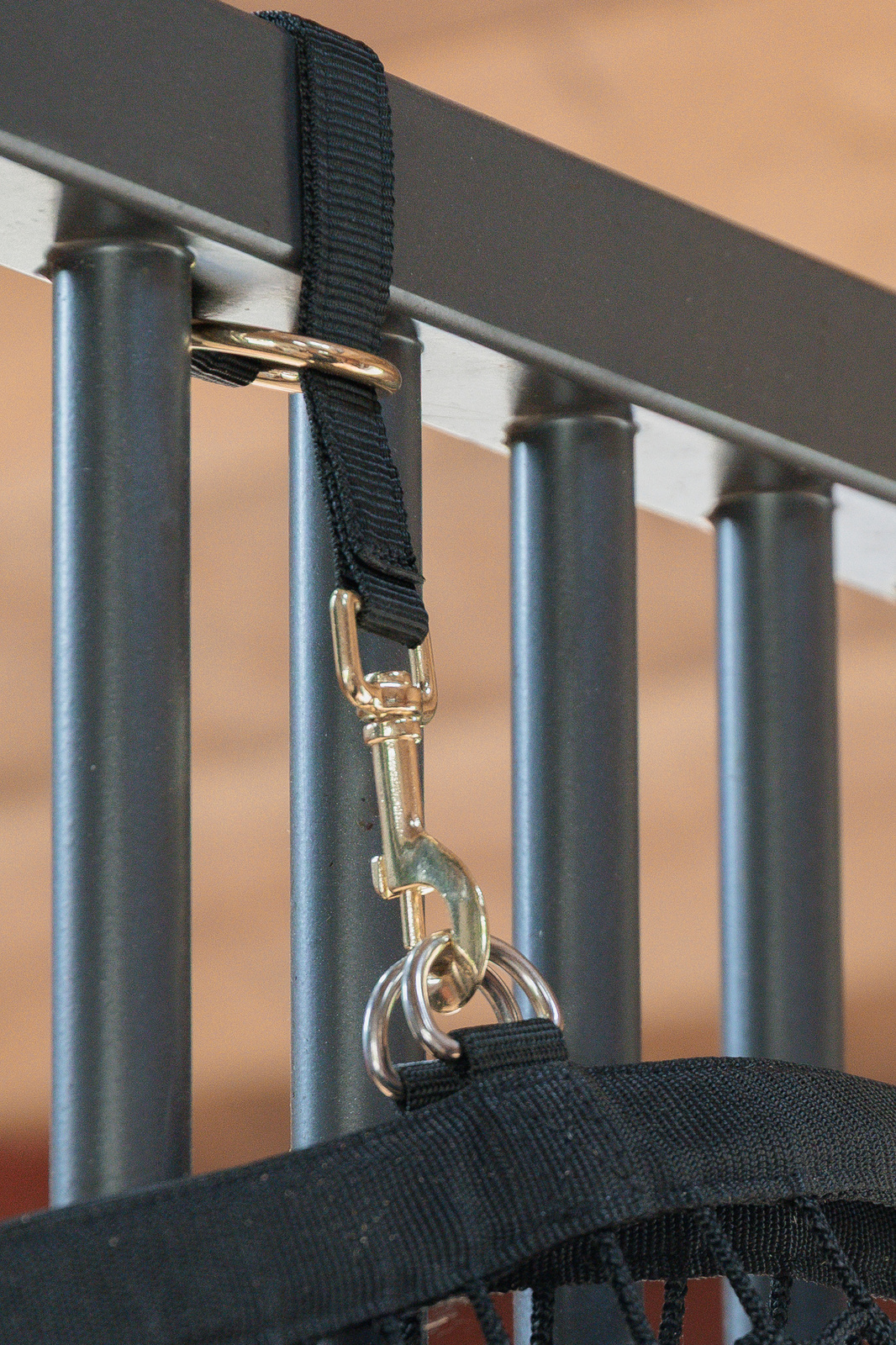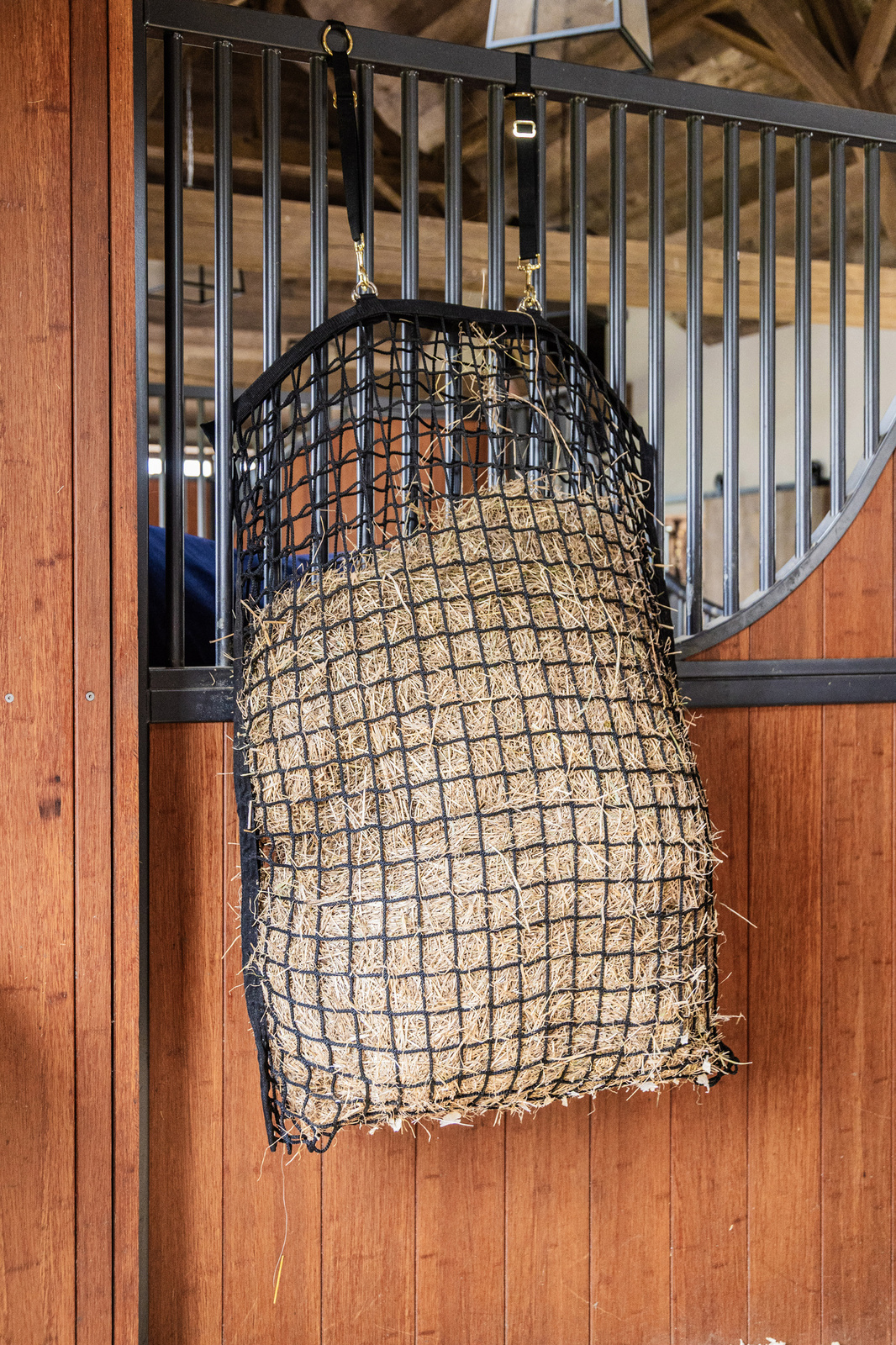 Solidna, trwała siatka została zaprojektowana do codziennego użytku w warunkach stajennych, a cztery wzmocnione pierścienie umożliwiają bezpieczne i elastyczne zawieszenie na różnych wysokościach, w zależności od potrzeb konia i rodzaju boksu.
