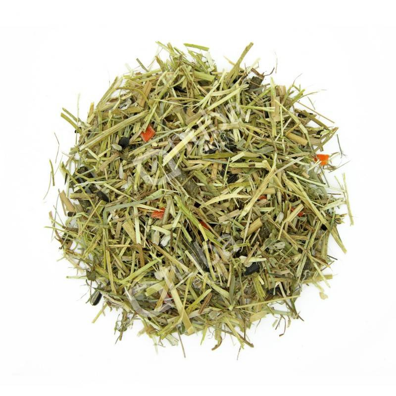 lucerna sieczka, lucerna granulat, sieczka z traw, słoma owsiana, drożdże paszowe, siemię lniane, łuska słonecznika, olej lniany, ziarno słonecznika, marchew suszona płatkowana, algi morskie, aminokwasowy chelat cynku, msm, tlenek magnezu, metionina, aminokwasowy chelat miedzi, witaminy, biotyna, selen, probiotyk
