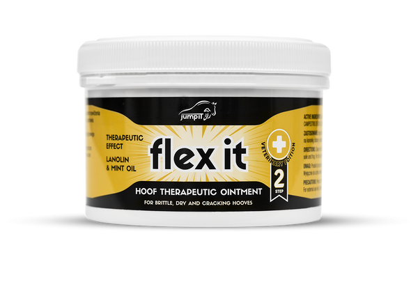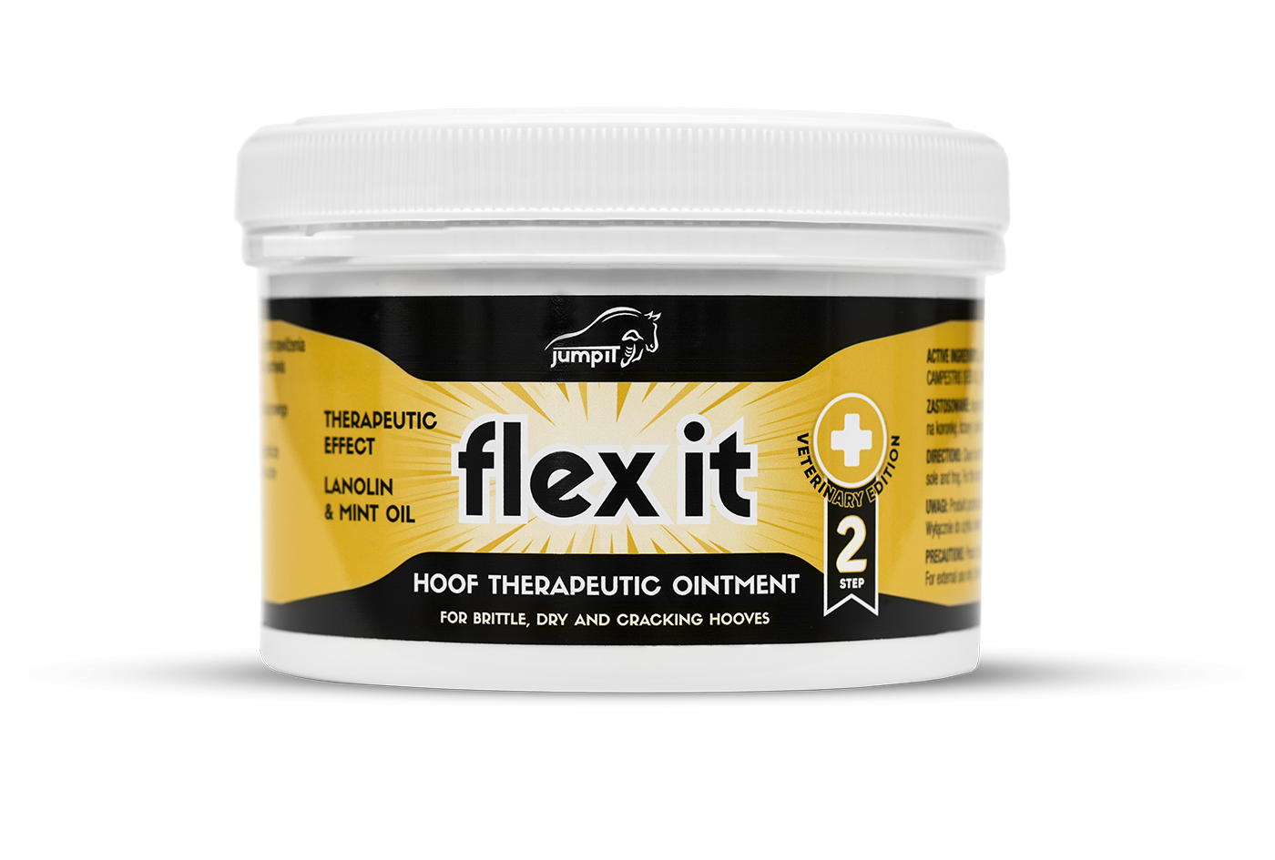 Specjalistyczny smar terapeutyczny opracowany z myślą o koniach zmagających się z osłabionymi, przesuszonymi, nadmiernie wilgotnymi lub mechanicznie uszkodzonymi kopytami. To drugi krok w dwuetapowej pielęgnacji kopyt opracowanej przez markę Jump it, idealnie uzupełniający działanie peelingu Scrub It. Podczas gdy Scrub It dogłębnie oczyszcza i przygotowuje kopyto, Flex It dostarcza niezbędnych składników odżywczych i tworzy warstwę ochronną, wspomagając regenerację oraz wzrost zdrowego rogu kopytowego.