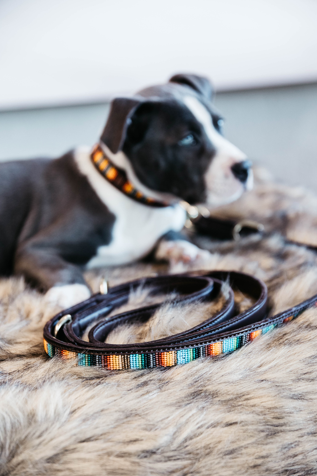 Smycz wykonana z wysokiej jakości sztucznej skóry, ozdobiona ręcznie perełkami, które nadają jej unikalny charakter.