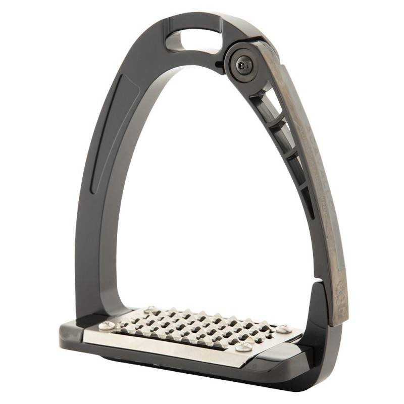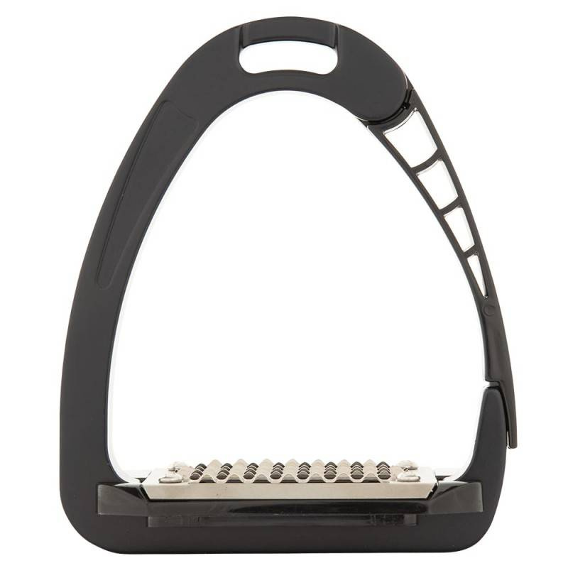 Aluminiowe strzemiona Acavallo wyposażone w szeroką wkładkę ze stali nierdzewnej i boczne otwieranie.