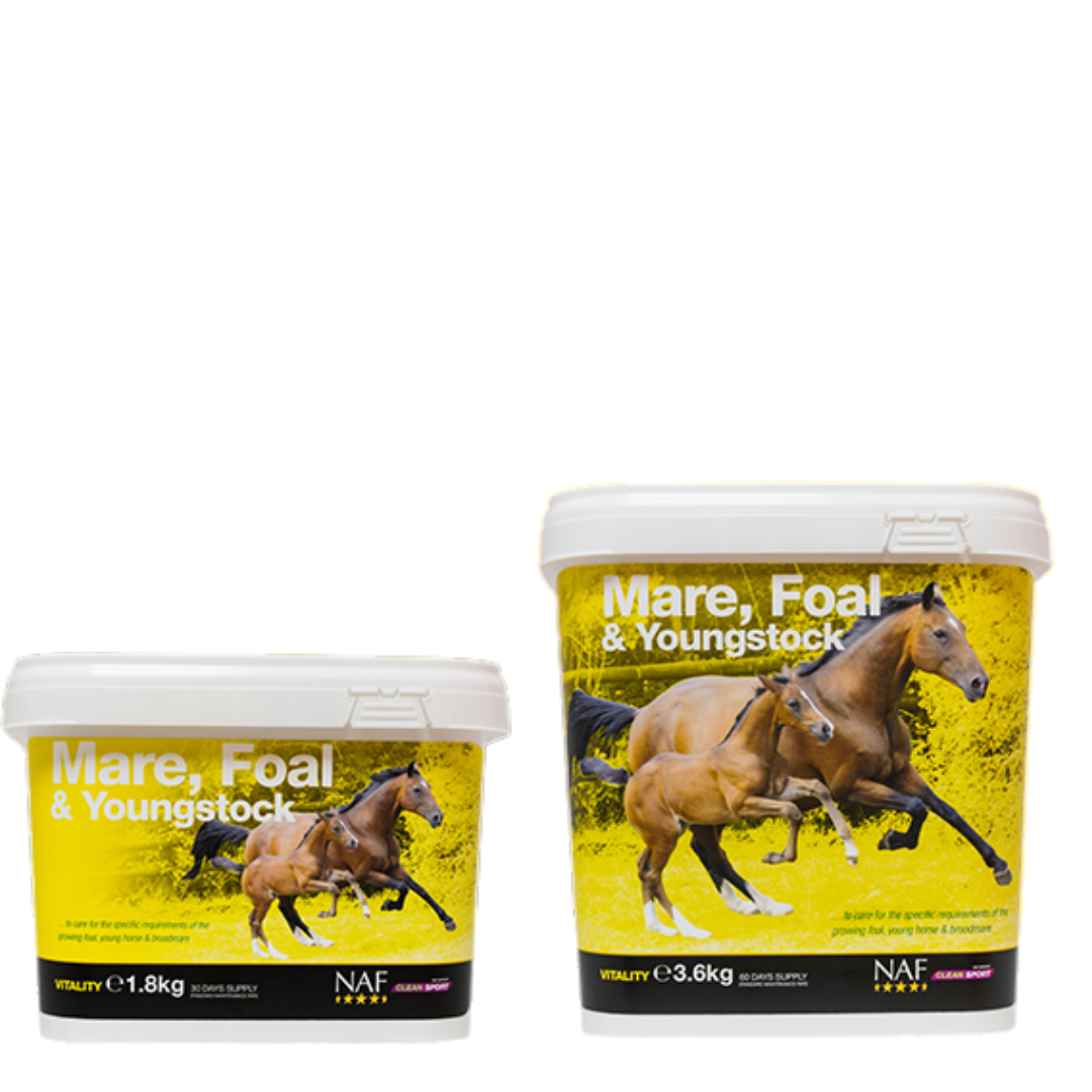 - NAF Mare, Foal & Youngstock Supplement to produkt stworzony z myślą o koniach w okresie intensywnego wzrostu, dostarczający niezbędne witaminy, minerały oraz aminokwasy, które wspierają prawidłowy rozwój organizmu.