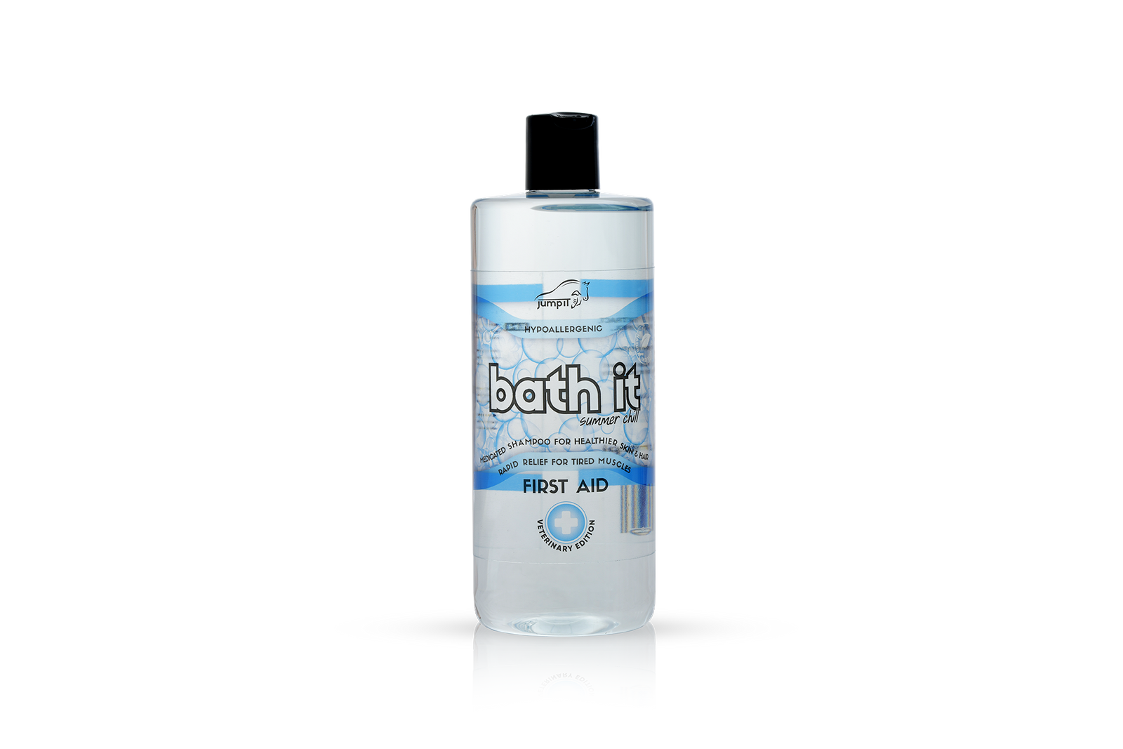 - Szampon bath it został zaprojektowany specjalnie dla wrażliwej i reaktywnej skóry koni. Głęboko oczyszcza, odżywia i kondycjonuje włosy. Dodatkowo ma delikatny efekt chłodzenia, co przynosi ulgę dla zmęczonych mięśni.