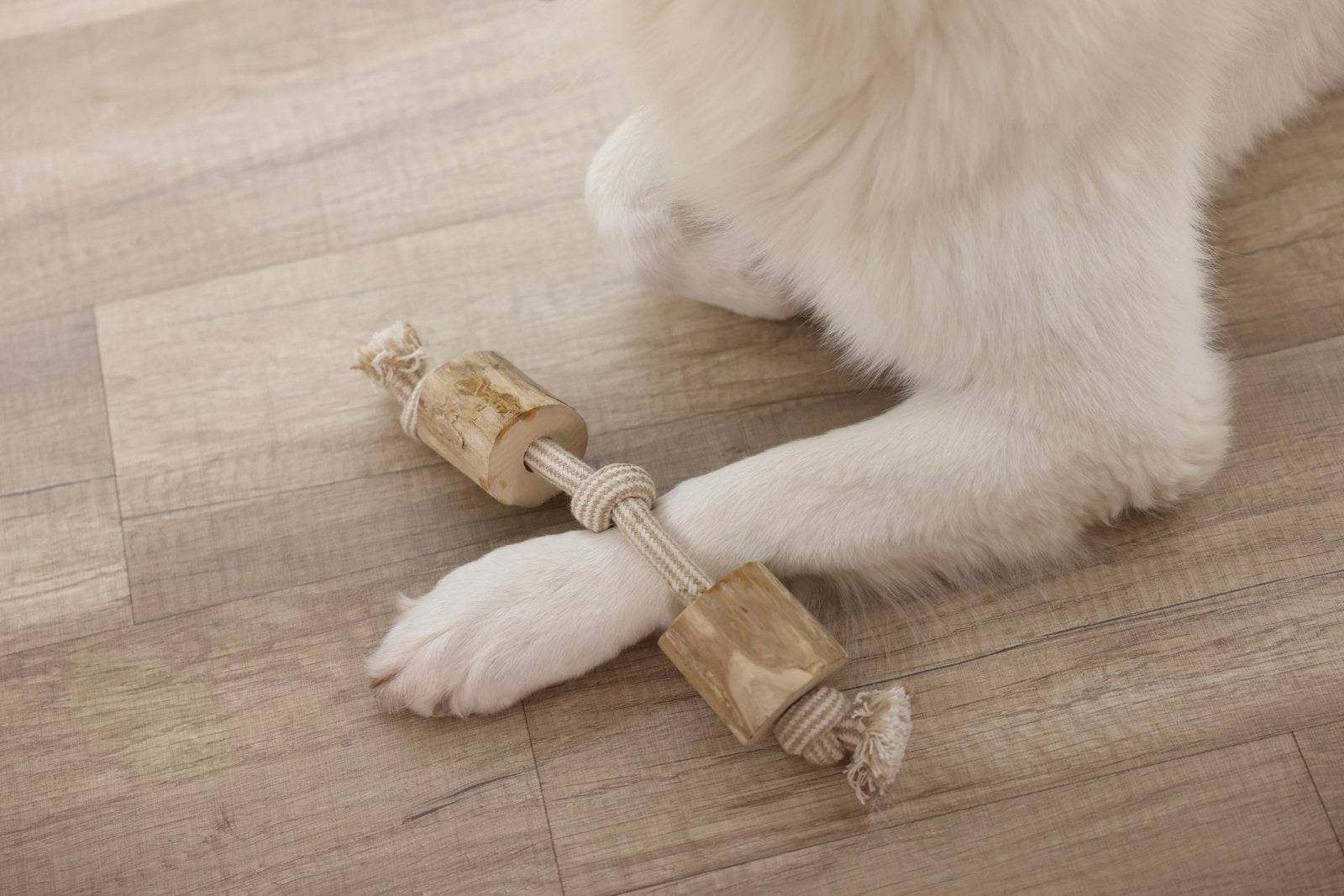 Drewno kawowe słynie z wyjątkowej twardości i odporności na rozwarstwianie, co sprawia, że jest znakomitym wyborem dla psów lubiących gryźć — w przeciwieństwie do wielu rodzajów drewna nie tworzy ostrych drzazg, lecz ściera się na drobne, bezpieczne włókna. Użycie szarpaka z juty i bawełny dodatkowo masuje dziąsła i pomaga usuwać osad zębów, wspierając naturalną higienę jamy ustnej.