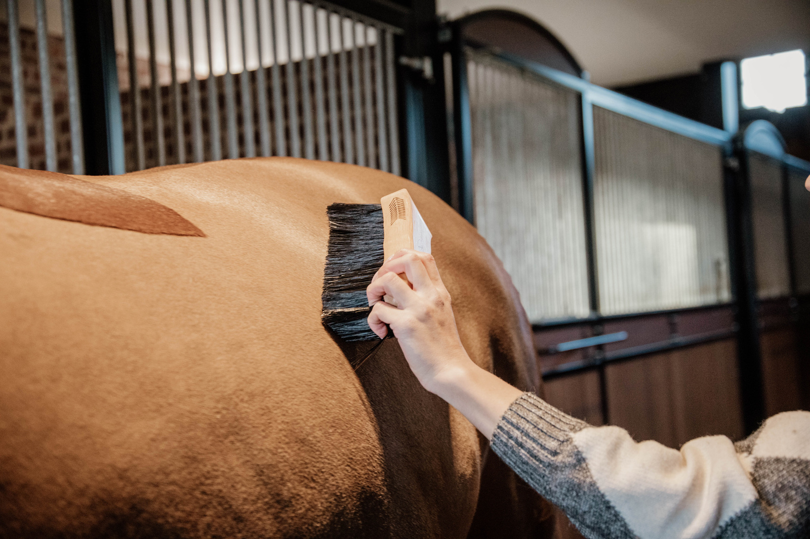 Twarde włosie sprawia, że szczotka idealnie nadaje się do używania w zimie, kiedy sierść jest gęstsza, lub na brudnym koniu.