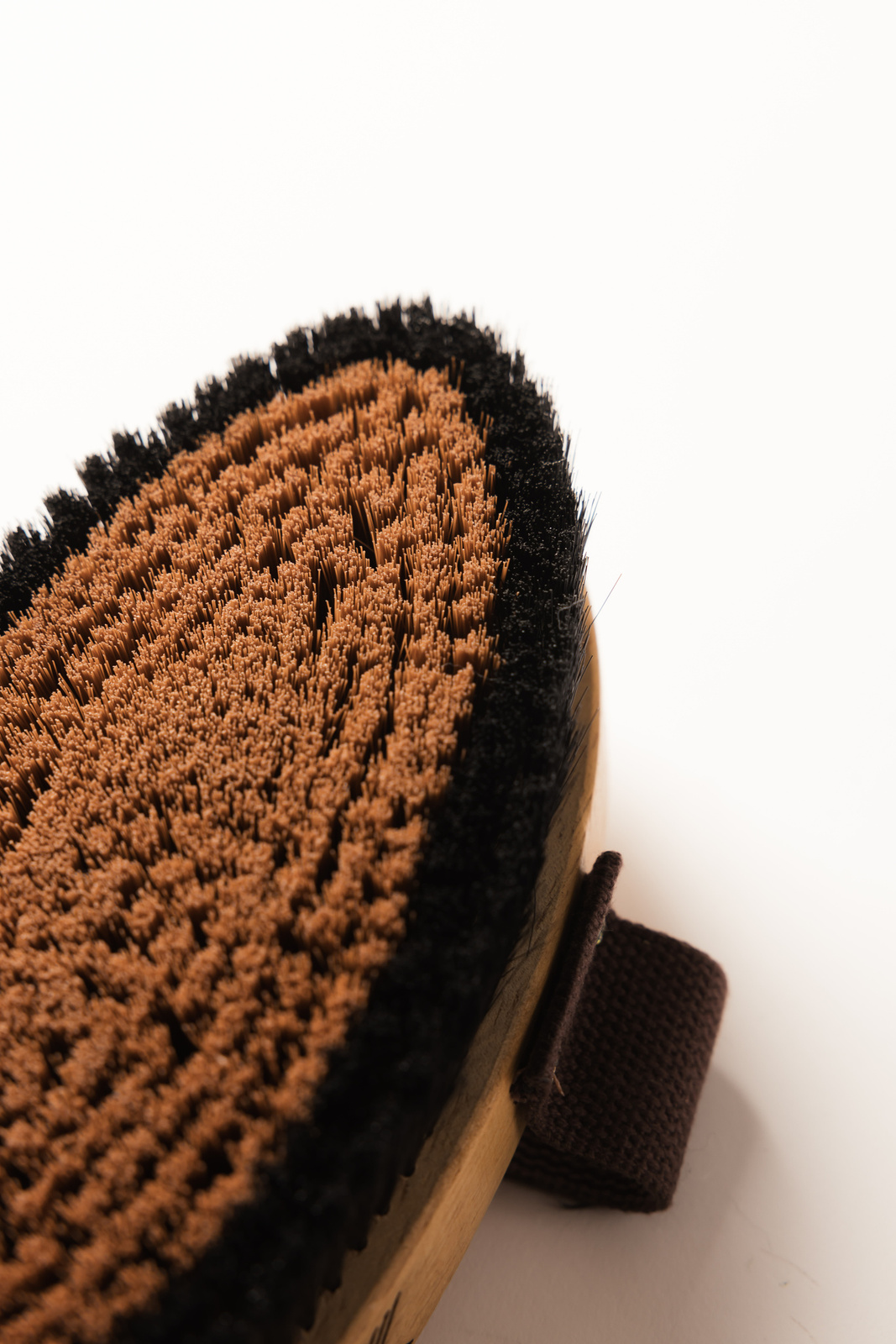 Owalna szczotka z krótkimi nylonowymi włosami, które równomiernie rozprowadzają naturalne oleje skóry, nadając sierści konia piękny, błyszczący wygląd.