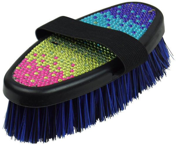 Szczotka do sierści, której górna część ozdobiona została kolorowymi kryształkami.