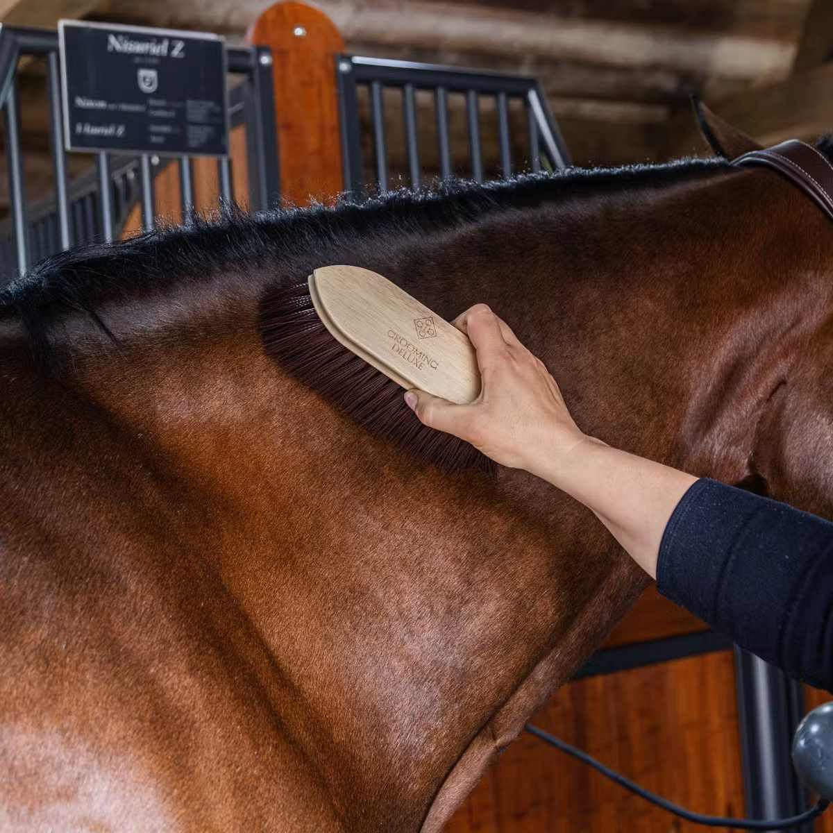 Miękka szczotka doskonale sprawdza się jako element wykańczający po wcześniejszym użyciu twardszych szczotek lub zgrzebła. Pomaga zebrać resztki kurzu, wygładzić sierść i przygotować konia do jazdy, spaceru czy prezentacji.