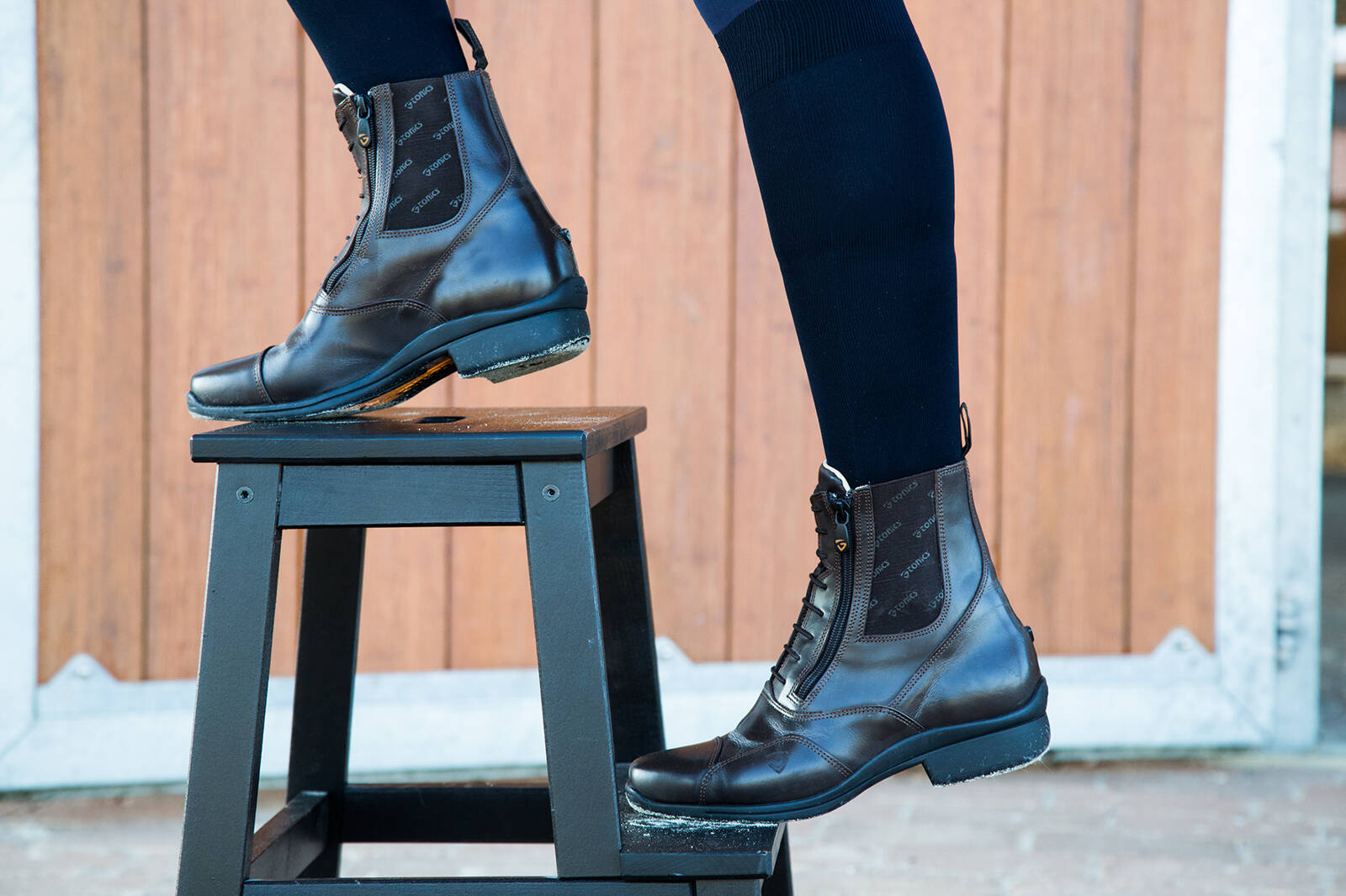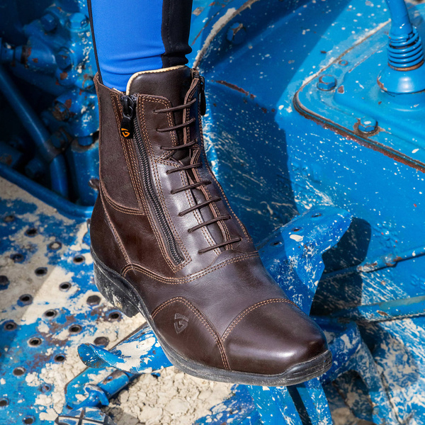 Posiada wodoodporny zamek błyskawiczny YKK oraz podpórki na ostrogi.
