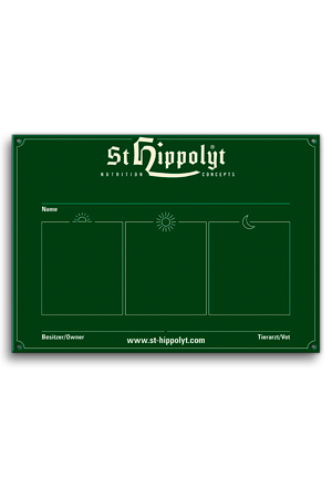 - Tabliczka na boks umożliwiająca rozpisanie dawki żywieniowej na poszczególne posiłki.