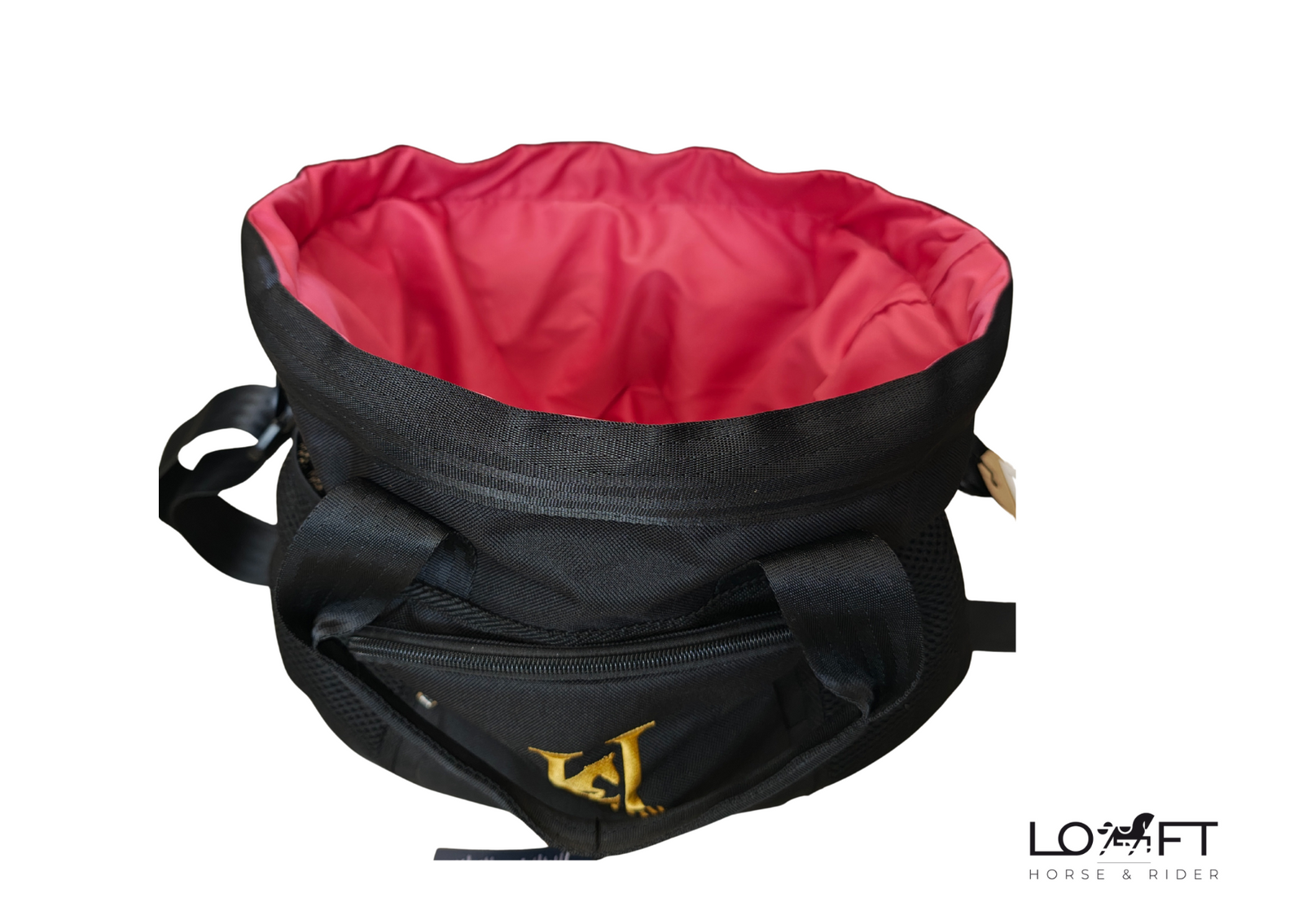 Główna komora, zapinana na sznurek ze ściągaczem, pomieści wszystkie niezbędne akcesoria do pielęgnacji konia – szczotki, grzebienie, preparaty czy ręczniki.