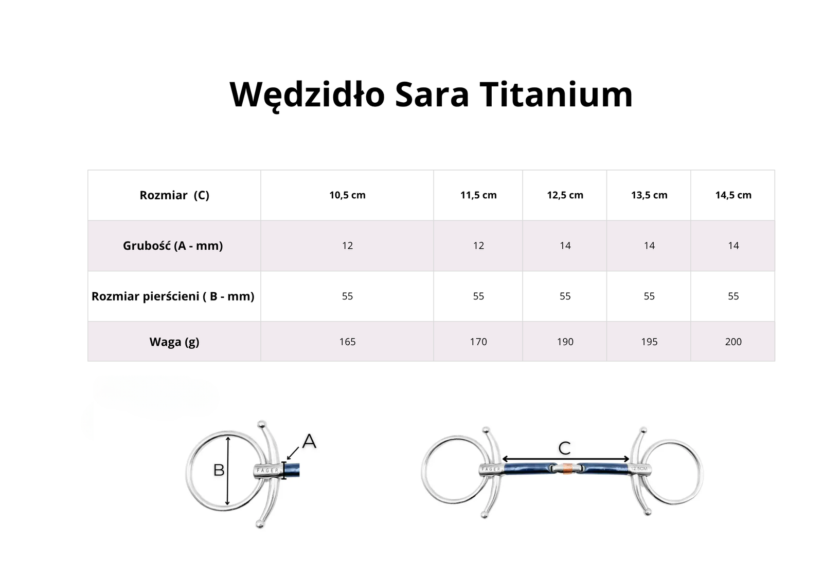 Fager oferuje wędzidła tytanowe w dwóch wersjach kolorystycznych: szarej oraz niebieskiej. Szary to naturalny odcień tytanu, który z czasem może stać się bardziej błyszczący w miejscach, gdzie koń intensywniej pracuje pyskiem. Niebieska wersja posiada dodatkową warstwę kolorystyczną, która może się ścierać w trakcie użytkowania, zwłaszcza u koni, które lubią żuć wędzidło. Jest to proces całkowicie naturalny, nieszkodliwy i nie wpływa na bezpieczeństwo ani funkcjonalność wędzidła.