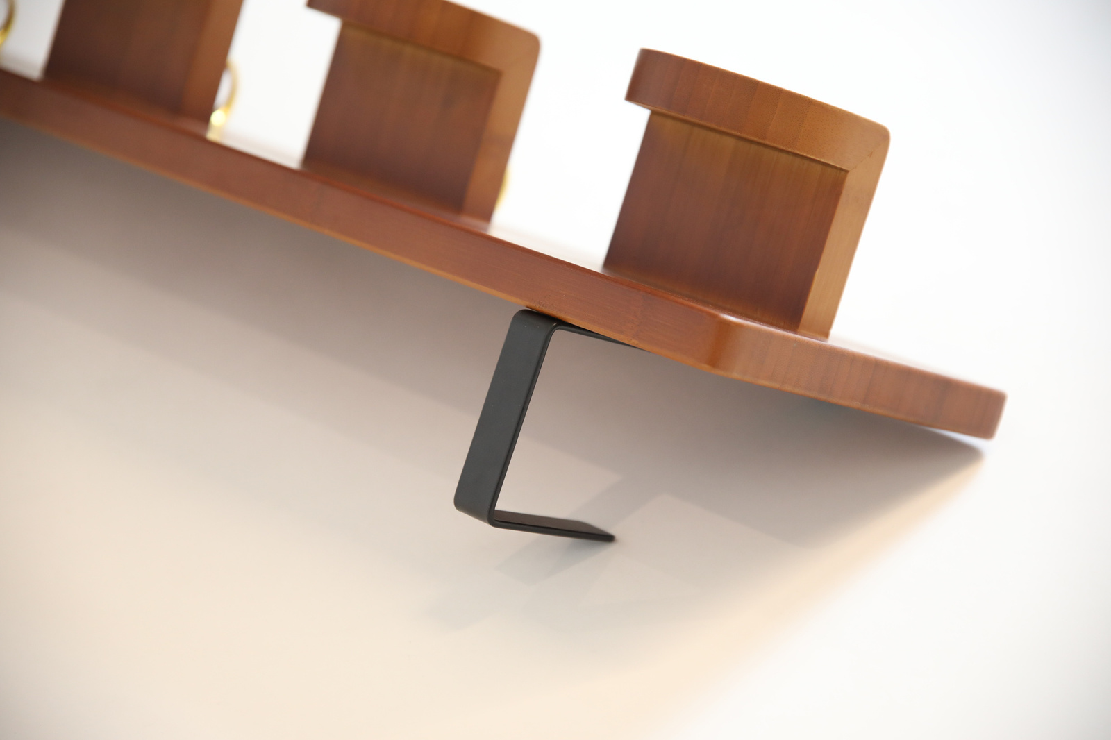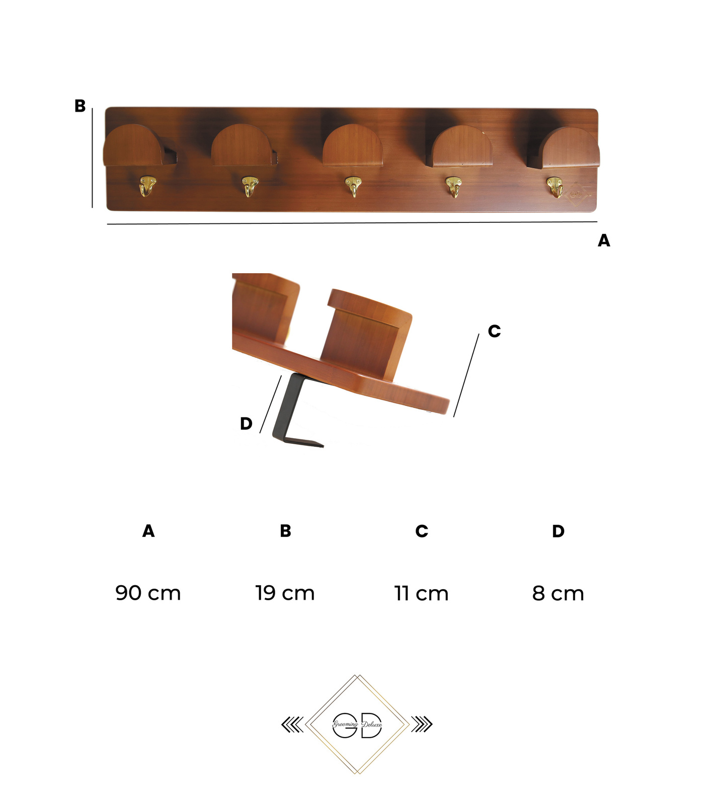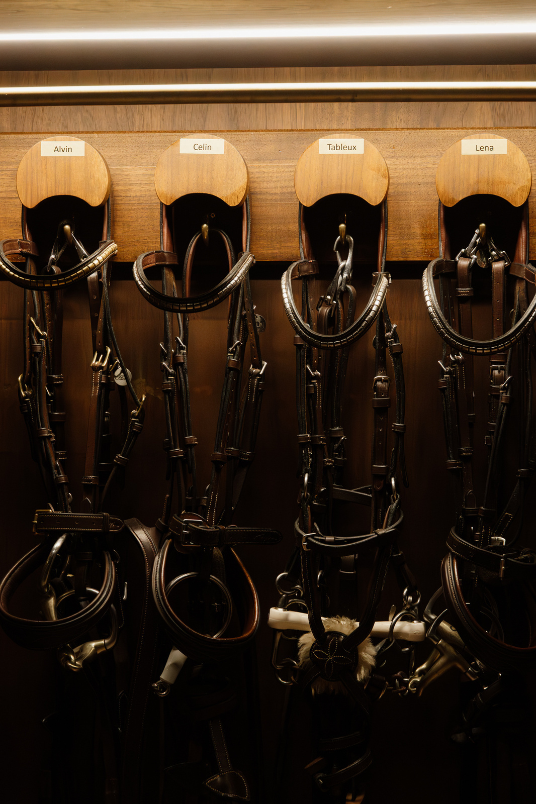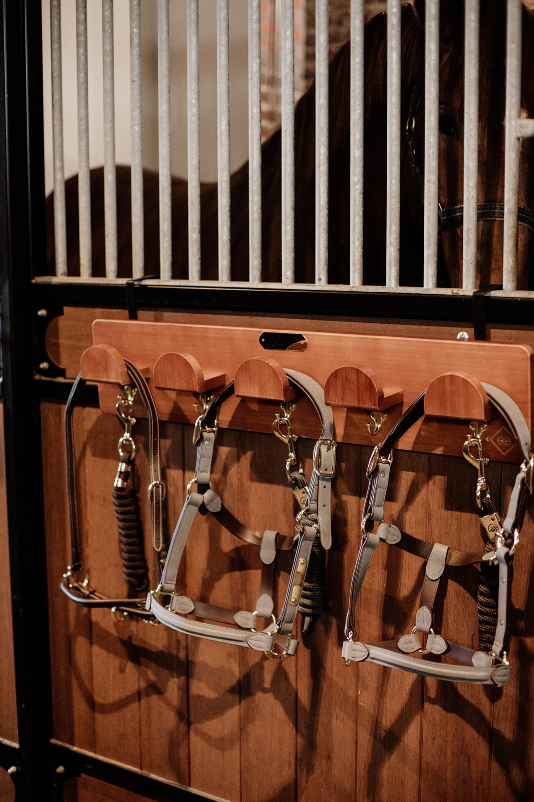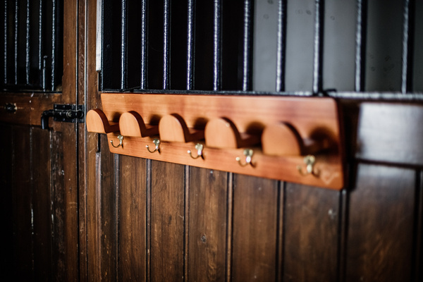 Wieszak ma miejsce na powieszenie pięciu ogłowi lub kantarów, ponad to posiada 5 złotych haczyków, które nie tylko nadają mu elegancki wygląd, ale także możliwość zawieszenia napierśników lub wodzy.