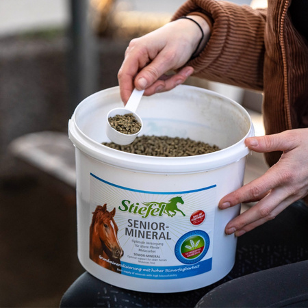 Senior Mineral oparty jest na naturalnej bazie: mączce z trawy, mączce lnianej, ziołach łąkowych oraz dodatku kopru włoskiego, anyżu i liści mięty pieprzowej. Dzięki temu wspiera również trawienie i apetyt, co jest szczególnie ważne w przypadku starszych koni z osłabionym łaknieniem lub problemami jelitowymi. Obecność łatwo przyswajalnego węglanu wapnia i fosforanu jednowapniowego sprzyja utrzymaniu prawidłowej struktury kości, a dodatek magnezu może pomóc regulować napięcie mięśniowe i ogólną równowagę nerwową.