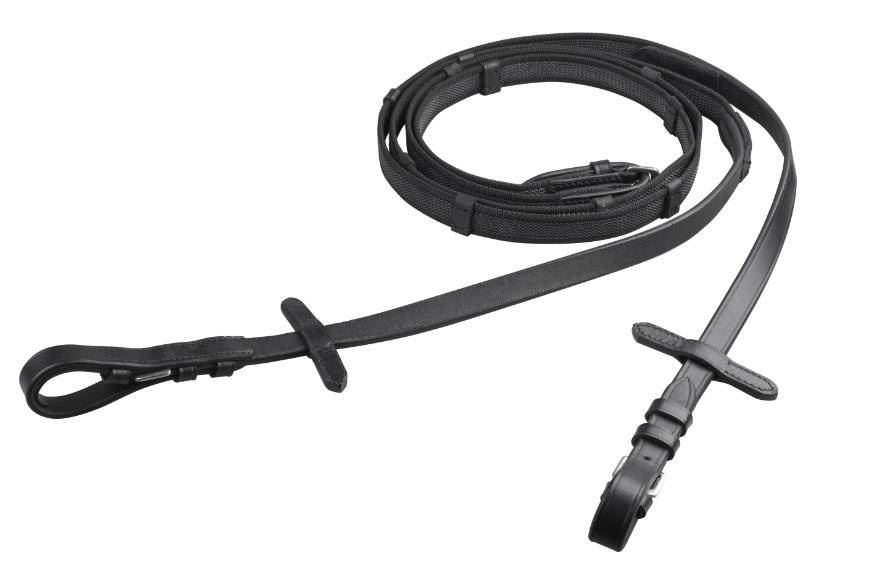 Antypoślizgowe wodze parciane, wykonane z materiału przeplatanego gumą. Posiadają skórzane stopery oraz motylki do wytoku. Zapinane na klasyczne sprzączki. Elementy metalowe wykonane ze stali nierdzewnej. Szerokość 19 mm.