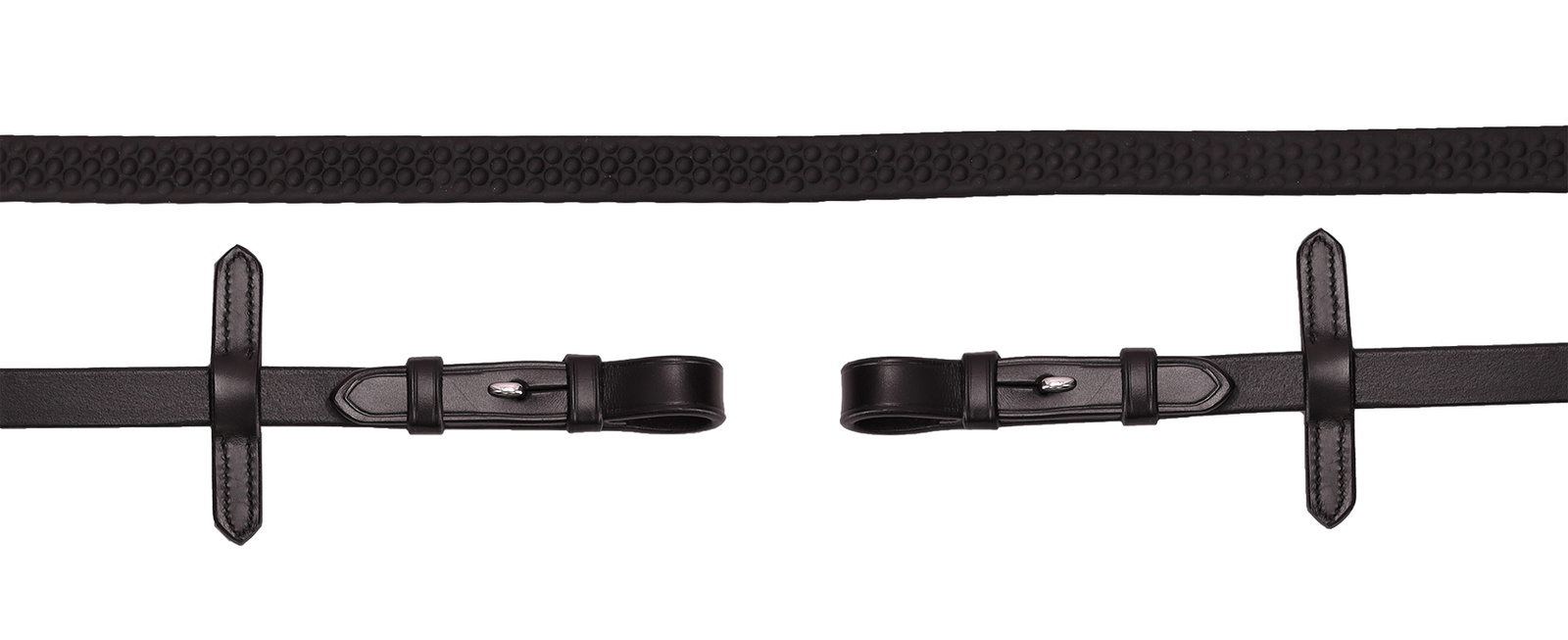 Wodze wykonane z płaskiej gumy z wypustkami, które umożliwiają stabilne trzymanie wodzy, co przekłada się na precyzyjniejsze i bardziej pewne prowadzenie konia.