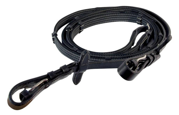 Gumowane wodze z okuciami w srebrnym kolorze.