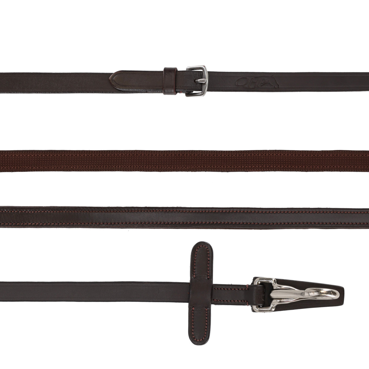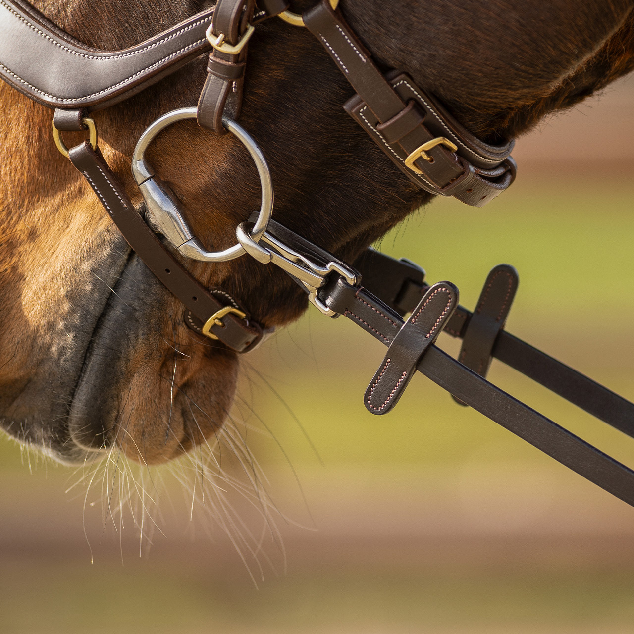 • Wodze z gumowym spodem, który jest antypoślizgowy i gwarantuje pewny chwyt nawet w trudnych warunkach – podczas jazdy w deszczu, przy spoconym koniu czy podczas intensywnych treningów.