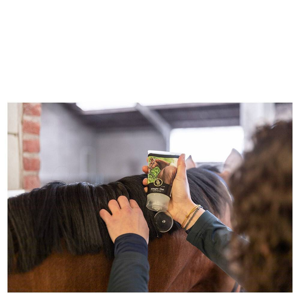 BR Magic Gel ułatwia rozczesywanie i sprawia, że grzywa i ogon konia stają się jedwabiście miękkie.
