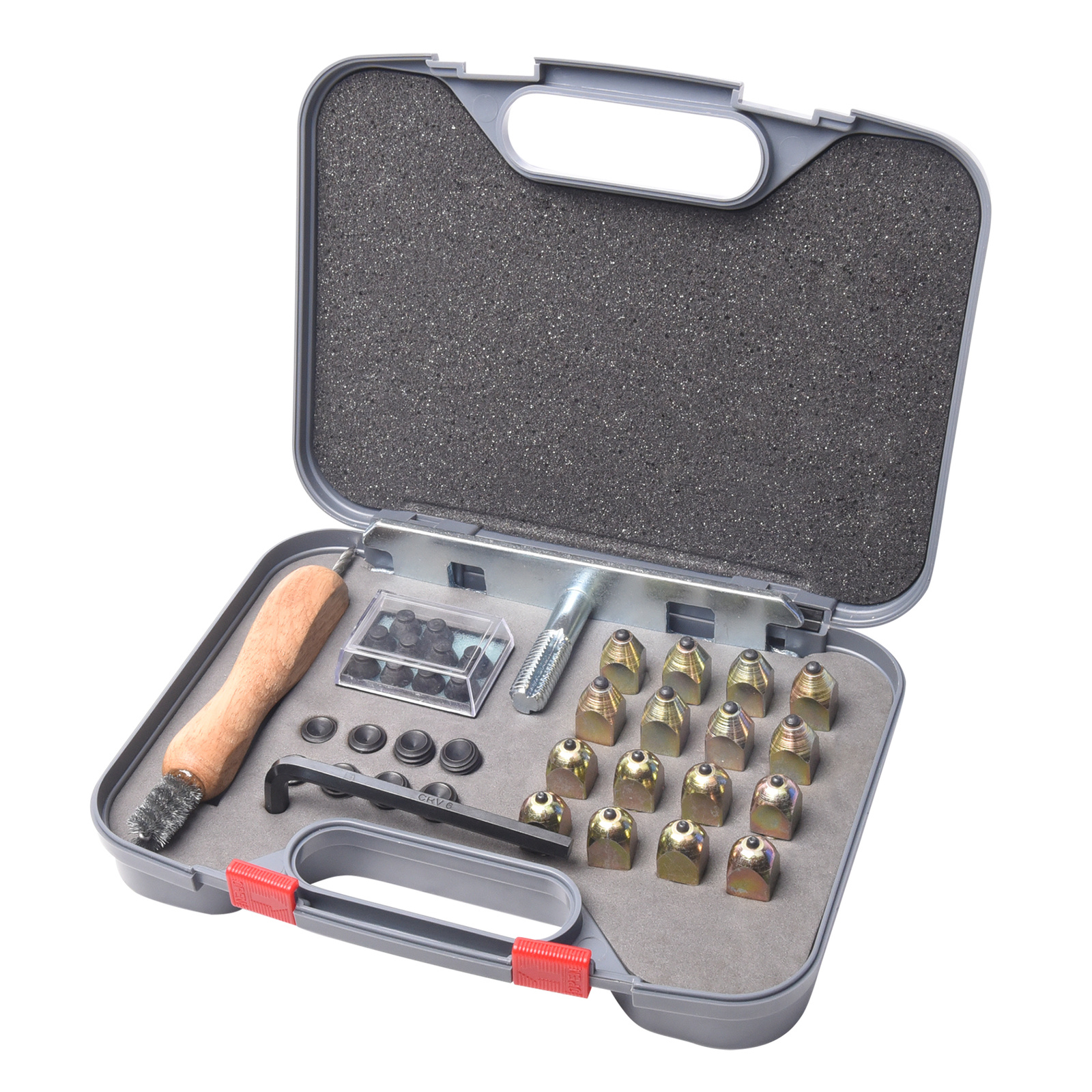 Dodatkowo, w zestawie znajdują się zatyczki, które chronią otwory przed zabrudzeniem i uszkodzeniem, a także narzędzia niezbędne do ich obsługi: szczotka do czyszczenia gwintów, narzędzie do czyszczenia gwintów oraz klucz.