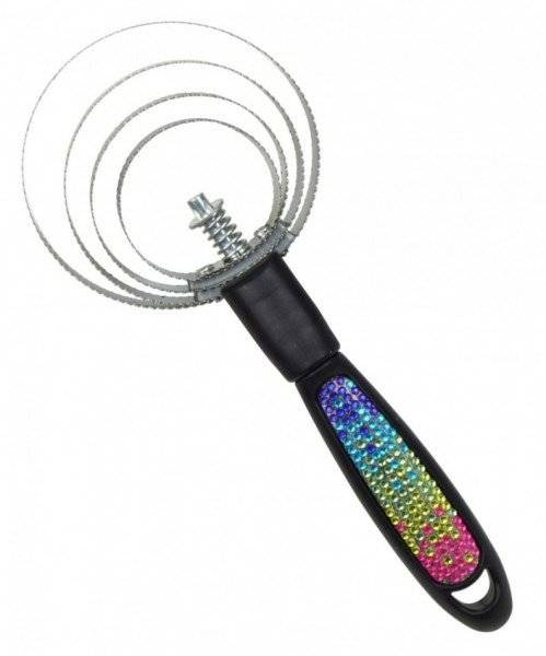 Metalowe zgrzebło wykonane ze stali nierdzewnej oraz plastiku. Uchwyt został ozdobiony kolorowymi kryształkami.